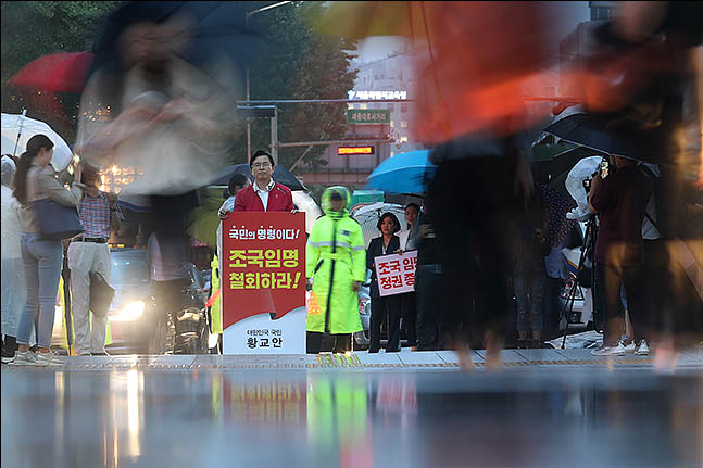 오가는 시민들 가운데 일부는 ‘조국 임명 철회하라’, ‘문재인은 하야하라’ 등의 구호를 외치기도 했다. 군복 차림의 한 시민은 1인 시위를 하고 있는 황 대표 앞에 무릎을 꿇고 박근혜 전 대통령을 석방시켜달라고 요청하기도 했다.